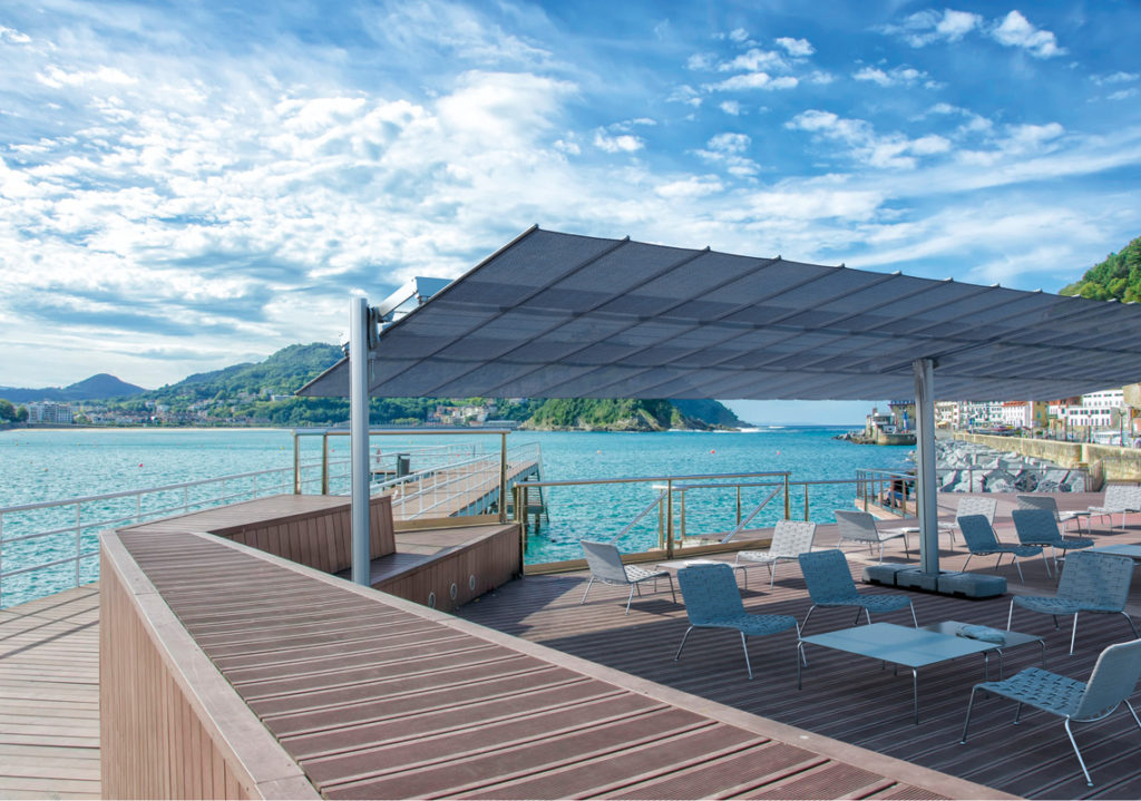 La copertura, facilmente richiudibile grazie ad un sistema ad arganello, è inclinabile per avere una maggiore ombra durante l’arco della giornata. La struttura è in alluminio con viteria in acciaio inox. Il Flexy Large può essere fornito sia con basi da appoggiare su terreno sia con basi da interrare.